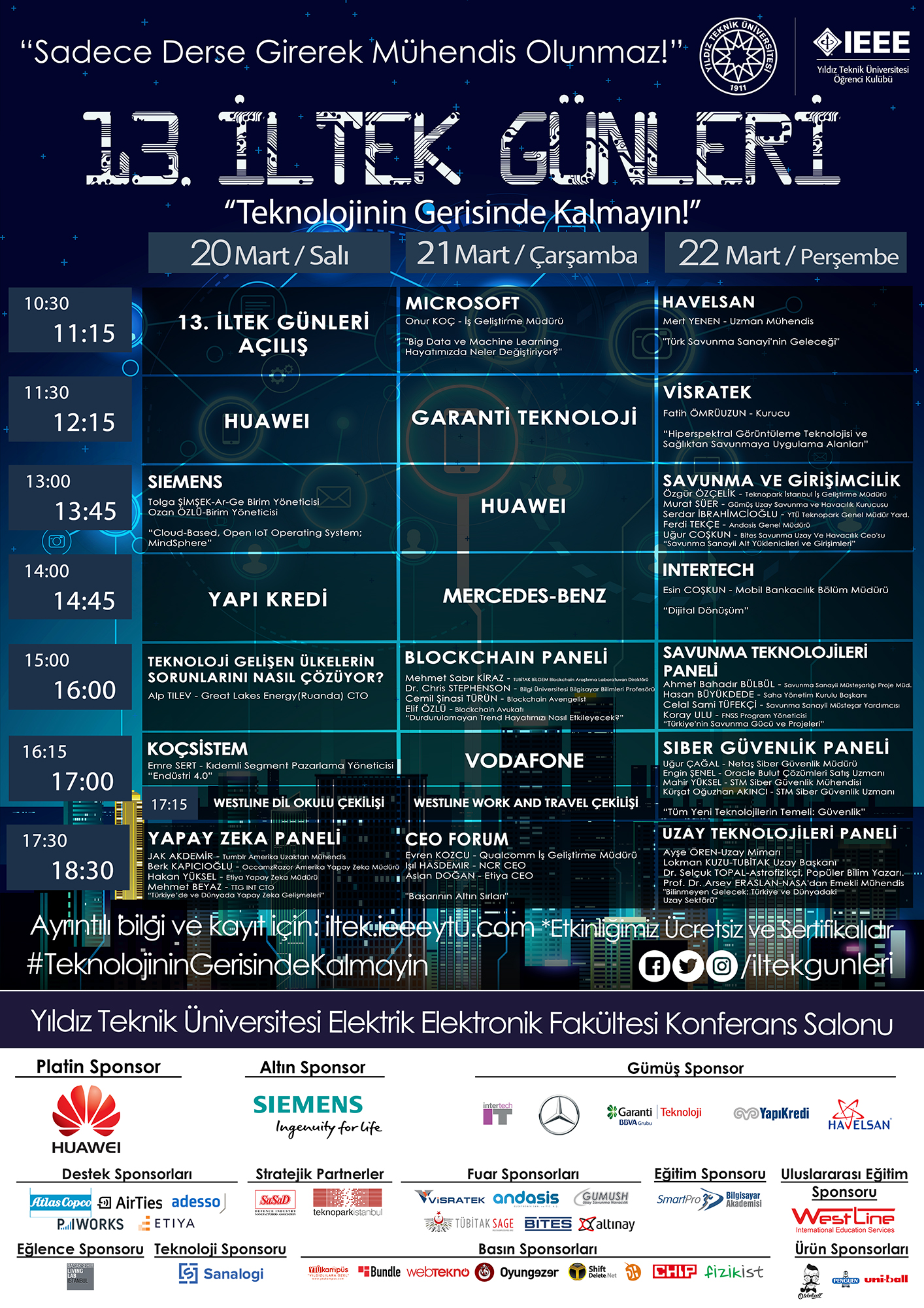 “Sadece Derse Girerek Mühendis Olunmaz!” sloganı ile YTÜ IEEE Öğrenci Kulübü; iletişim, bilişim, yazılım, savunma sanayii, elektronik ve telekomünikasyon sektörleri başta olmak üzere gelişen dünyanın trendlerini ve en güncel teknolojik gelişmelerini mercek altına alarak, bu sene 14.’sünü düzenlediği İLTEK Günleri ile teknoloji dünyasının dev isimlerini öğrencilerle buluşturacak. 14. İLTEK Günleri, 19-20-21 Mart 2019 tarihlerinde Davutpaşa Kampüsü Elektrik-Elektronik Fakültesi Konferans Salonu’nda gerçekleşecek.